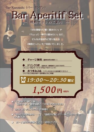 いつも平日の静かな時間になにか出来ないかな?と考えていたのですが、この度、「Bar Aperitif Set ~晩酌セット~」というものを企画してみました。
