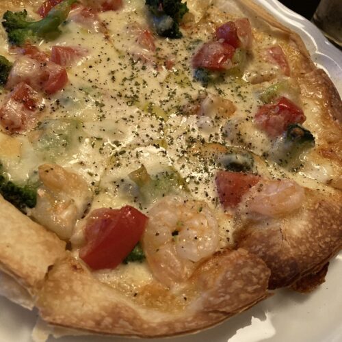 その具材は「えび、小柱、ブロッコリー、トマト、バジルオイル、ホワイトソース」を使用したピザ。