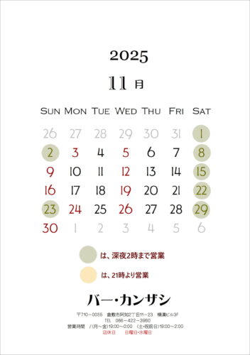 11月の営業日カレンダー、お客様から教えていただけるまで、投稿していない事に気がついておりませんでしたので、本日投稿致します。