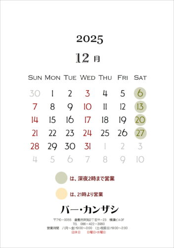 Info 2025 Nov 25 2025年12月の営業日 皆様、こんにちは!バー・カンザシです。 12月の営業日カレンダーを投稿しておきます。 忘年会もピークを迎えると思いますが、二次会、三次会や飲み足りない一人飲みなど、 是非ともご利用くださいませ。 皆様のご来店をスタッフ一同、心よりお待ちしております。