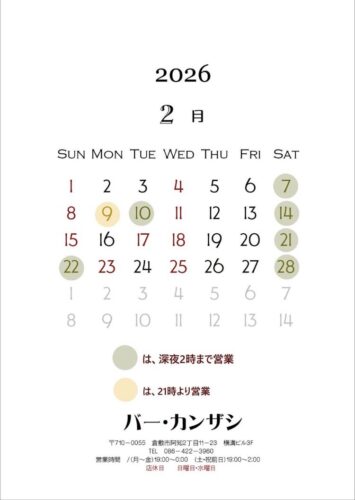 2026年2月の営業カレンダー