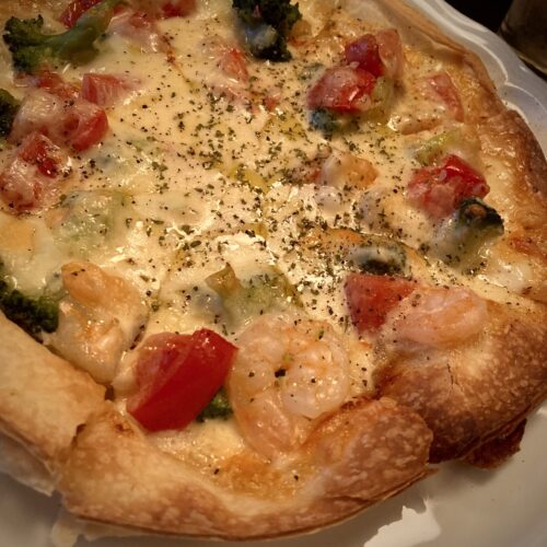 ホワイトソースのシーフードピザ