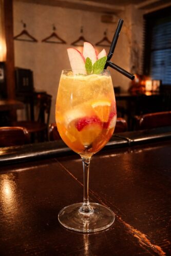 赤ワインにオレンジやバナナ、パイナップルなどのフルーツを入れ、甘みを付けて温めたホットカクテル。